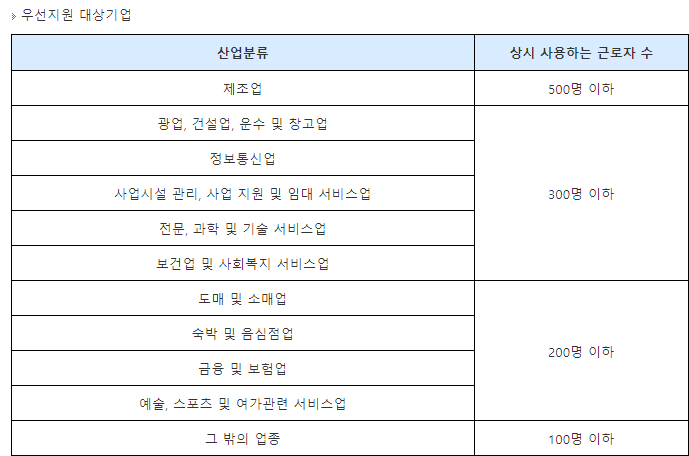 | 우선지원대상기업 | 제조업 : 500명 이하 광업/건설업/운수업/출판, 영상, 방송통신 및 정보서비스업/사업시설관리 및 사업지원 서비스업/전문, 과학 및 기술 서비스업/보건업 및 사회복지 서비스업 : 300명 이하 도매 및 소매업/숙박 및 음식점업 /금융 및 보험업/예술, 스포츠 및 여가 관련 서비스업 : 200명 이하 그 밖의 업종 : 100명 이하 |