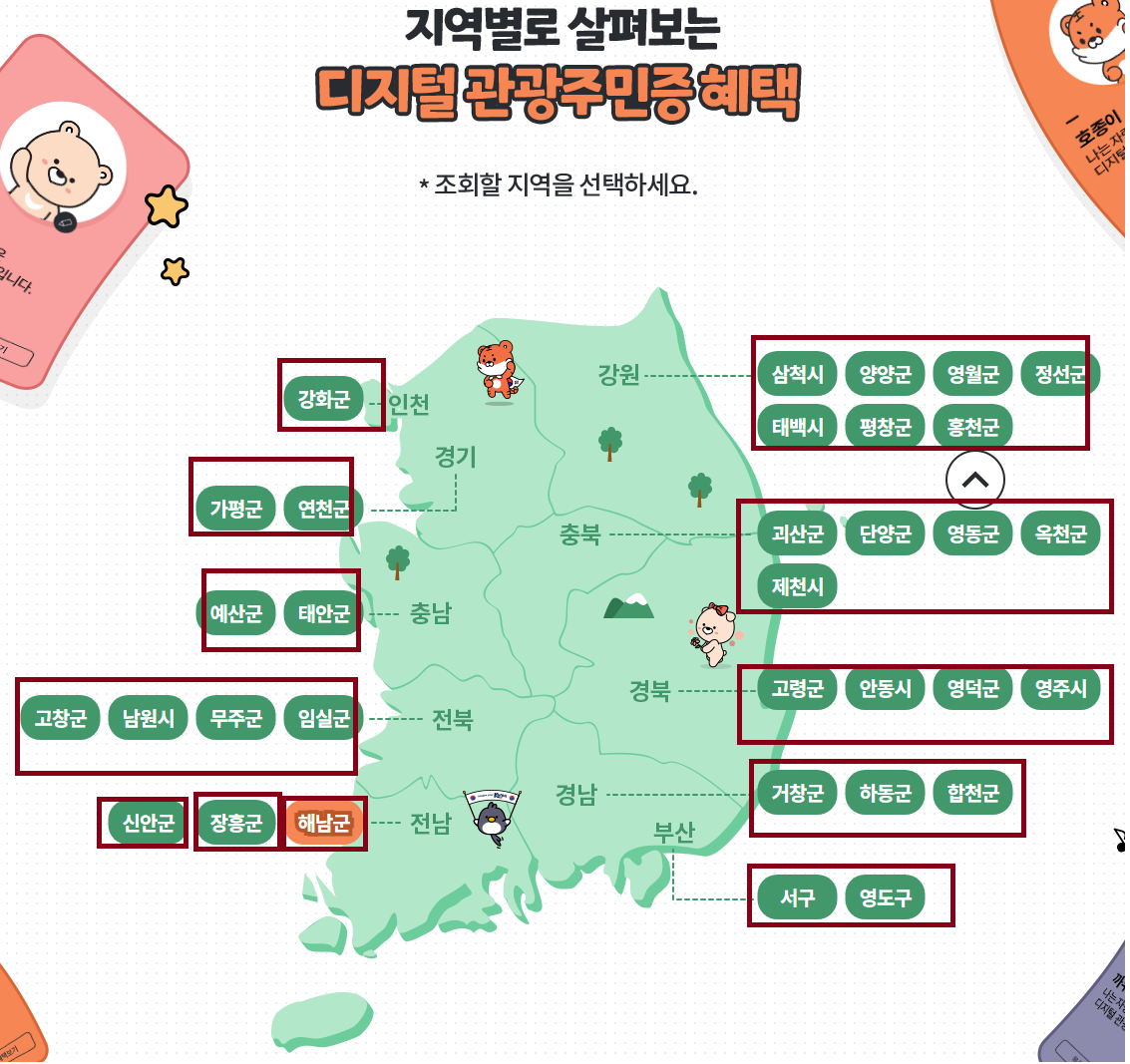 그 후 휴대폰 인증 후 원하시는 지역 관광 주민 버튼을 누르고 확인 버튼을 누르면 발급이 완료됩니다.
