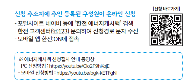 | 지급방법 | 매월 산정된 캐시백은 다음달 전기요금 청구 시 반영 ※ 캐시백 산정기간 중 신청자의 주소지가 변경된 경우 캐시백 지급 제외 |
