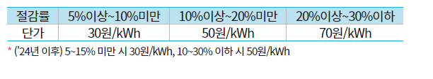 | 차등 캐시백 | 동일지역 참여자의 평균절감률과 상관없이 절감률 5% 이상 달성 시 30%를 한도로 하여 절감률 구간별로 1kWh당 30~70원을 차등 지급합니다. |