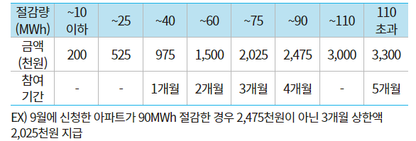 | 기본 캐시백 | 최소절감률 3%와 동일지역 참여자 평균절감률 이상을 달성한 경우, 절감량 1kWh당 30원을 지급합니다.(단, 절감률 30% 한도로 지급) | 최소절감률 3%와 동일지역 참여아파트 평균절감률 이상을 달성한 경우 달성한 절감량에 따라 구간별로 정액 지급합니다. (단, 절감률 30% 한도로 절감량 산정) 절감실적에 대한 중복지급 방지를 위해 해당 아파트에서 캐시백을 지급받은 세대의 절감량은 차감하여 산정합니다. 참여기간 별 상한액 설정 |