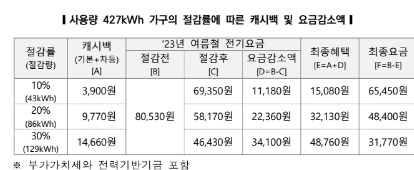 캐시백 최대 지급한도인 30%까지 사용량을 줄인다면 캐시백(1만 4660원)과 요금감소액(3만 4100원)을 합한 금액이 4만 8760원이 돼 전기요금은 지난해보다 약 52% 감소한 3만 1770원이 된다.