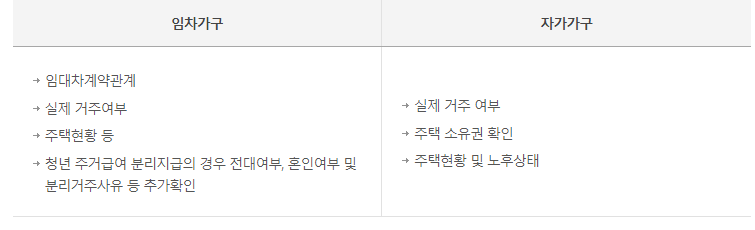 신청자가 주거급여 신청을 하게 되면 ①소득 및 재산조사와 ②주택조사를 거쳐 지원여부를 결정하게 됩니다.