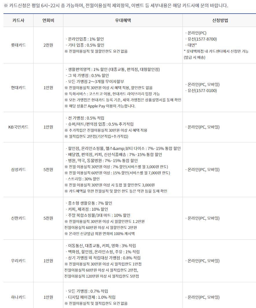 | 카드사 | 신청 바로가기 PC 버전 | 신청 바로가기 모바일 버전 |
