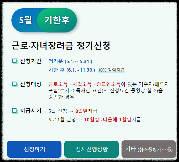 반기신청은 2023년 상반기 소득분에 한해서 장려금이 주어집니다. 신청은 9월 1일부터 15일까지고 지급일은 12월 말쯤으로 예상되며 35%로만 선 지급 됩니다. 그리고 후에 소득귀속연도 다음 연도 5월에 정기 신청했을 경우의 지급액과 비교하여 정산합니다.